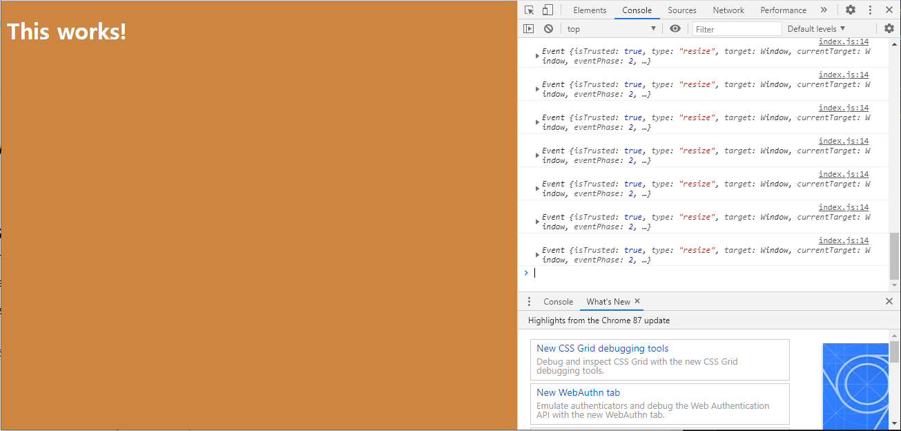 window.addEventListener("resize", handleRezise())와 같이 작성하면 함수가 조건에 관계 없이 항상 호출되므로,
